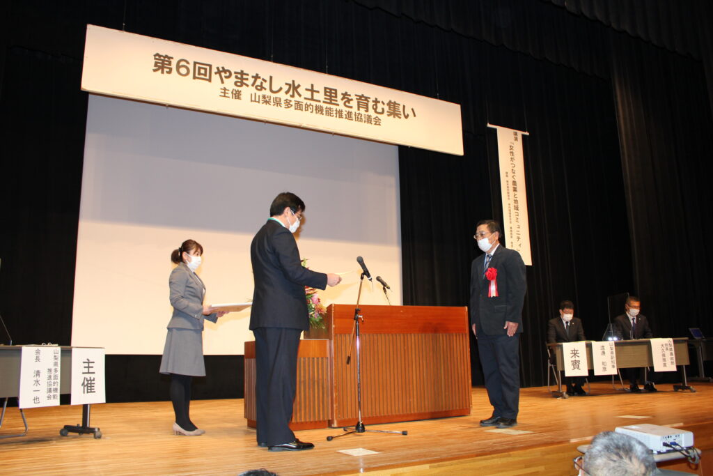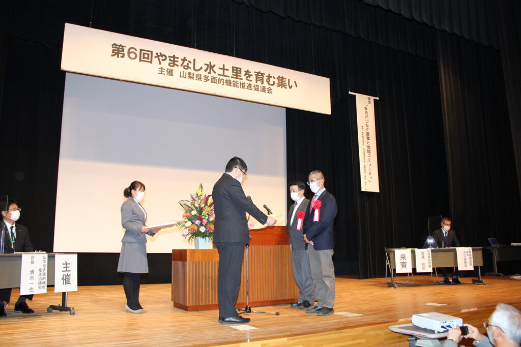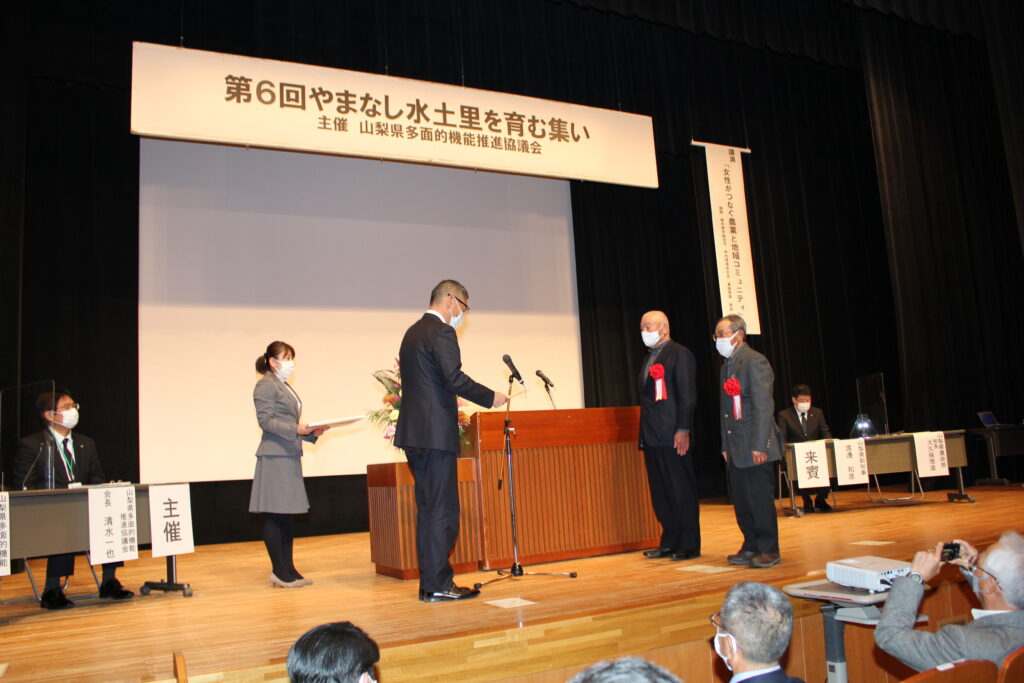 今年度は甲斐市双葉ふれあい文化館 ホールで行われ、農業農村整備への積極的な推進、地域農業の体験学習への協力、それらも含め地域の果樹農業システムが世界農業遺産へ認定された甲州市 東雲保全会が知事賞を受賞されました。